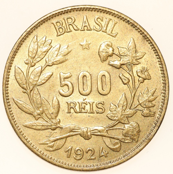 • Moeda do Brasil: 500 Réis 1924 - Flor de Cunho - Cuproníquel