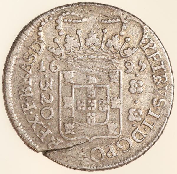 • Moeda do Brasil: 320 Réis 1695 Coroa Larga (B) - Al P111 - Prata - MBC