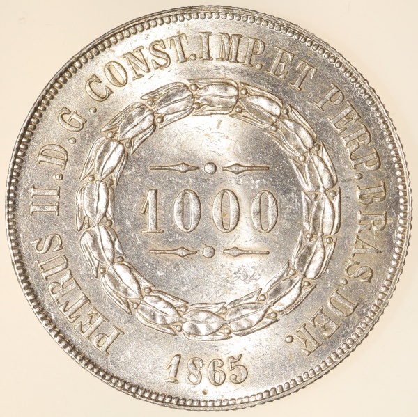 • Moeda do Brasil: 1000 Réis 1865 - Flor de Cunho - Maravilhosa, belo brilho de cunhagem -  Prata