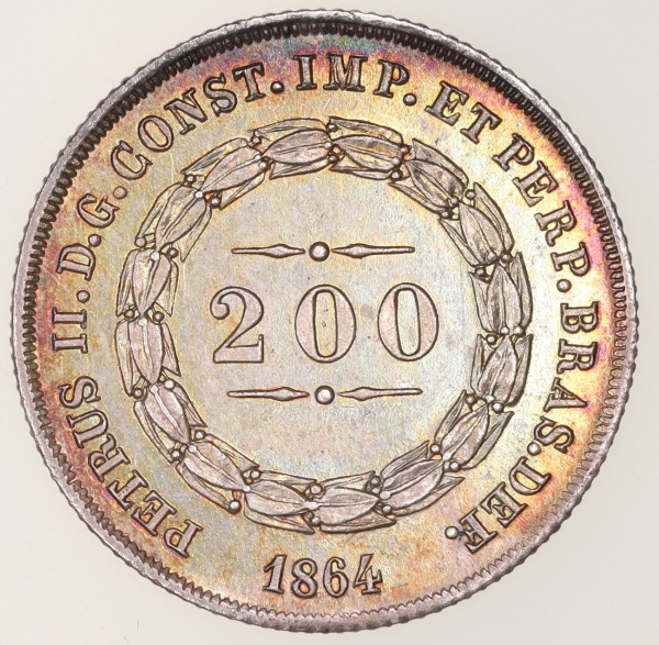 • Moeda do Brasil: 200 Réis 1864 - Flor de Cunho - Uma bela patina colorida no anverso  - Prata