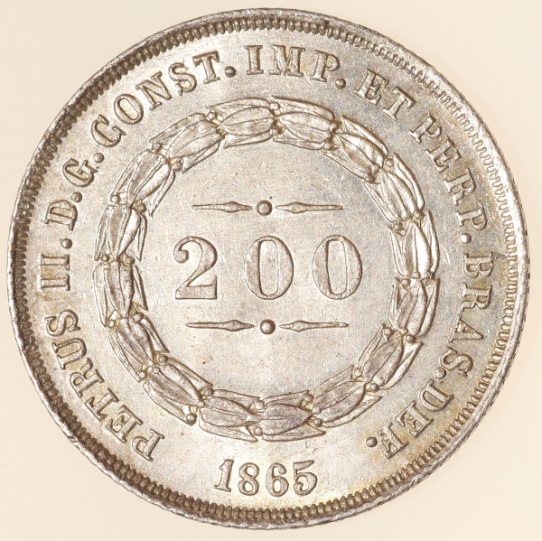 • Moeda do Brasil: 200 Réis 1865 - Flor de Cunho -   - Prata
