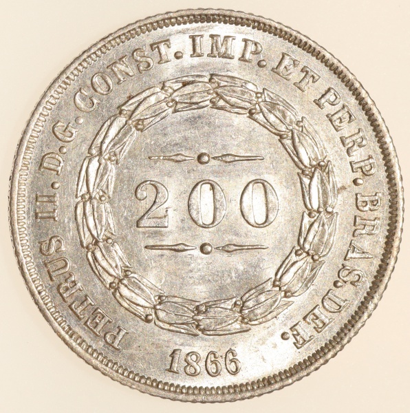 • Moeda do Brasil: 200 Réis 1866 - Flor de Cunho - Belo brilho de cunhagem  - Prata