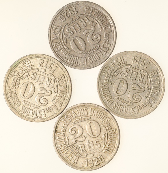 • Moeda do Brasil: Lote contendo 4 moedas de 20 Réis - 1918, 1919 e 2 de 1920