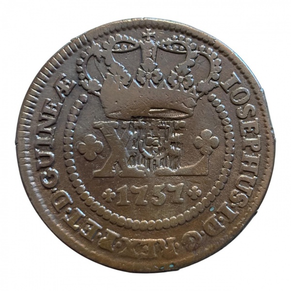 • Moeda do Brasil:  XL Réis 1757 GUINEAE, 49 Pérolas, com carimbo de escudete.  Comprada encontro Goiania do Gilberto Bailão. 24/05/2025.  - Cobre