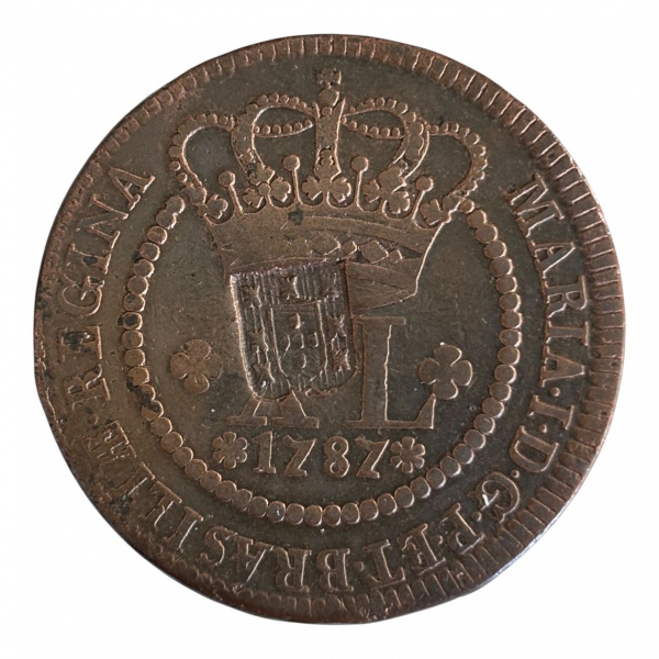 • Moeda do Brasil: XL Réis de 1787, 48 pérolas, Coroa Alta, com carimbo de escudete - Cobre