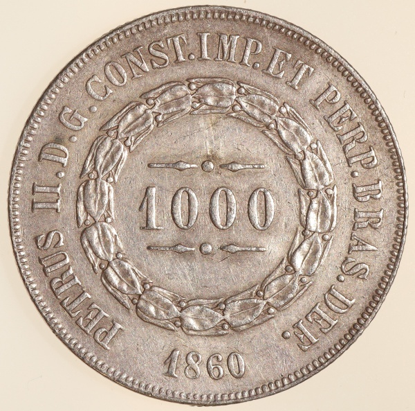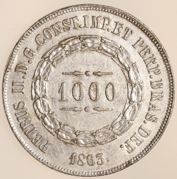• Moeda do Brasil: 1000 Réis 1863 - Leve Inclinacao - Al P611 - Prata - Sob+