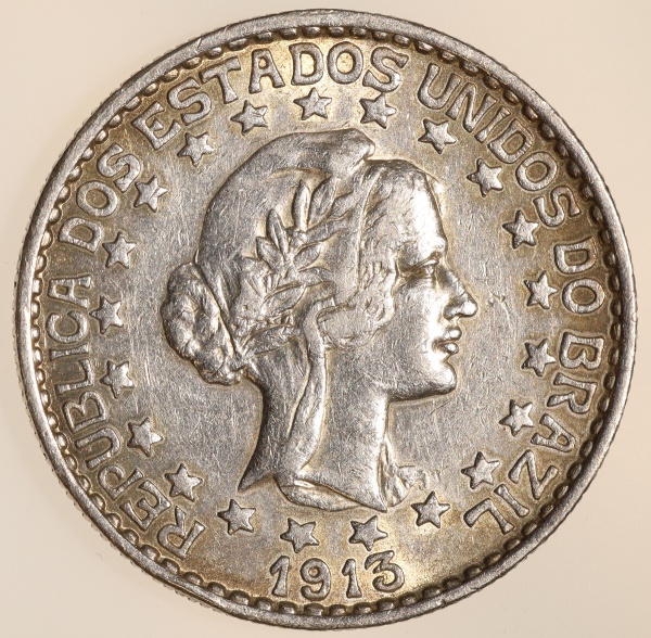 • Moeda do Brasil: 2000 Réis 1913 - Al P708 - Estrelas Soltas - Prata - Sob+